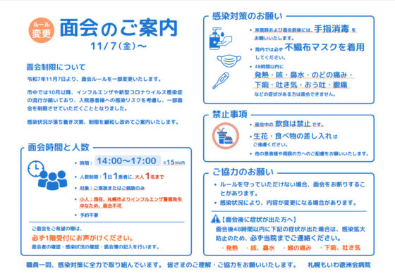 令和7年11月7日より、面会ルールを一部変更いたしました。