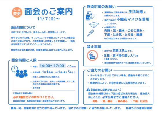 令和7年11月7日より、面会ルールを一部変更いたしました。