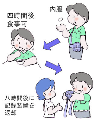 カプセルを飲み込んで四時間後からは食事も行う事ができます。夕方(ほぼ8時間後)に再び来院していただき、腰に装着した記録装置を取り外します。その後、カプセルは便中に排出されます。当然使い捨てです。