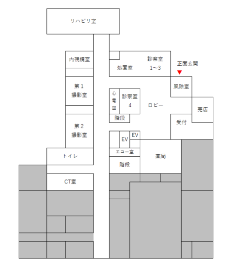 1階 | 外来診察室・外来処置室・内視鏡室・心電図室・エコー室・レントゲン室・CT室・臨床検査室・理学療法室・ 薬局・DI室・給食室・事務室・売店・ティーラウンジ・リハビリ室 |